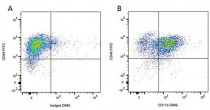 Flow Cytometry: Figure A. ARG23400 anti-CD45 antibody [YKIX716.13] (FITC) and purified Mouse IgG1 isotype control detected with Goat anti Mouse IgG1 DyLight 649. Figure B. ARG23400 anti-CD45 antibody [YKIX716.13] (FITC) and purified Mouse anti Canine CD11b detected with Goat anti Mouse IgG1 DyLight 649. All experiments performed on red cell lysed Canine blood gated on mononuclear cells.