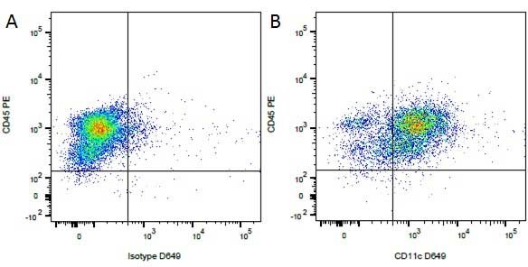 Flow Cytometry: Figure A. ARG23400 anti-CD45 antibody [YKIX716.13] (FITC) and purified Mouse IgG1 isotype control detected with Goat anti Mouse IgG1 DyLight 649. Figure B. ARG23400 anti-CD45 antibody [YKIX716.13] (FITC) and purified Mouse anti Canine CD11b detected with Goat anti Mouse IgG1 DyLight 649. All experiments performed on red cell lysed Canine blood gated on mononuclear cells.