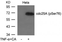 Western blot: Extracts from HeLa cells untreated or treated with TNF-a and CA stained with ARG51638 anti-CDC25A phospho (Ser76) antibody.