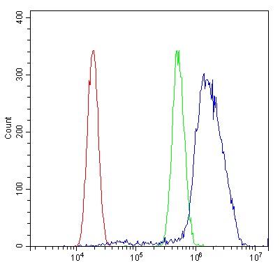 Flow Cytometry: U2OS cells were blocked with 10% normal goat serum and then stained with ARG58571 anti-EphA2 antibody (blue) at 1 µg/10^6 cells for 30 min at 20°C, followed by incubation with DyLight®488 labelled secondary antibody. Isotype control antibody (green) was rabbit IgG (1 µg/10^6 cells) used under the same conditions. Unlabelled sample (red) was also used as a control.