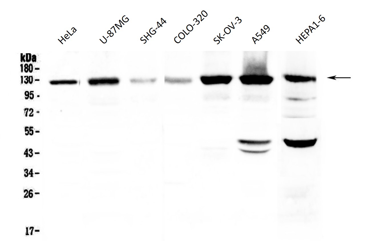 Western blot: 50 µg of HeLa, U-87MG, SHG-44, COLO-320, SK-OV-3, A549 and HEPA1-6 cell lysates stained with ARG58571 anti-EphA2 antibody at 0.5 µg/ml, overnight at 4°C, under reducing conditions.
