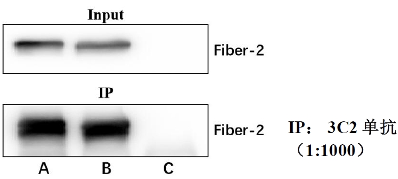 A: LMH cells infected with FAdV-4, B: LMH cells infected with FAdV-10, C: Uninfected LMH cells IP results demonstrate that monoclonal antibody 3C2 can effectively immunoprecipitate the Fiber-2 proteins of FAdV-4 and FAdV-10.