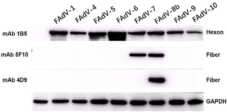 Western Blot (WB) was used for specificity detection. The results demonstrate that monoclonal antibody 5F10 can effectively recognize FAdV-7 and FAdV-8b Fiber proteins, while monoclonal antibody 4D9 can only effectively recognize FAdV-8b Fiber protein.