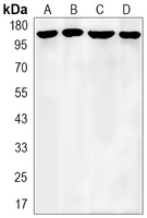 Western blot analysis of APC expression in Hela (A), A549 (B), HL60 (C), U2OS (D) whole cell lysates. (Predicted band size: 312 kD; Observed band size: 160 kD)
