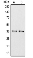 Western blot analysis of Apolipoprotein L6 expression in COLO205 (A), K562 (B) whole cell lysates. (Predicted band size: 38 kD; Observed band size: 38 kD)