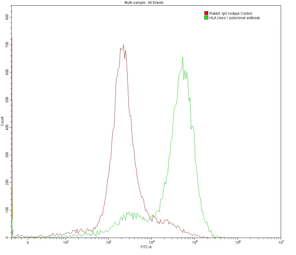 1X10^6 MOLT4 were surface stained with 0.2 ug HLA class I rabbit polyclonal antibody and Rabbit IgG Isotype Control. AREX® Fluor 488 Rabbit IgG(H+L) Multiclonal Goat Monoclonal antibody was used at 1:500 for detection.
