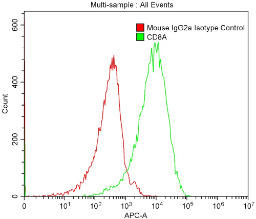 1X10^6 MOLT4 were surface stained with 0.2 ug Human CD8 and Mouse IgG2a Isotype Control. AREX® Fluor 647 Mouse IgG(H+L) Multiclonal Goat Monoclonal antibody was used at 1:500 for detection.