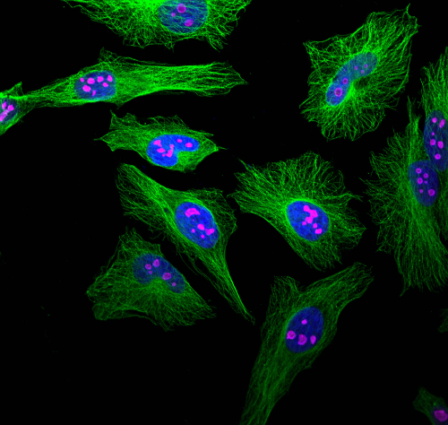 Immunofluorescence of Hela cells: Hela cells were fixed with 4% PFA and stained with Alpha Tubulin Rabbit polyclonal antibody (green) and NPM1 mouse monoclonal antibody (magenta). AREX® Fluor 488 Rabbit IgG(H+L) Multiclonal Goat Monoclonal antibody and AREX® Fluor 647 Mouse IgG(H+L) Multiclonal Goat Monoclonal antibody were used for detection.