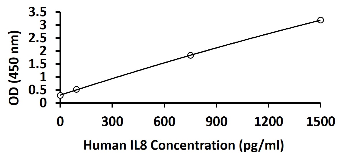 ARG83509 arigoPLEX® Human Inflammatory Cytokine Multiplex ELISA Kit results of a typical standard for Human IL8 run with optical density reading at 450 nm.