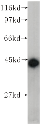 HEK-293 cells were subjected to SDS PAGE followed by western blot with Beta Actin Mouse Monoclonal antibody(ARA711) at dilution of 1:2000 incubated at room temperature for 1.5 hours.