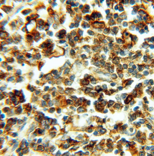 Immunohistochemical analysis of paraffin-embedded human spleen using Beta Actin Mouse Monoclonal antibody(ARA711) at dilution of 1:100 .