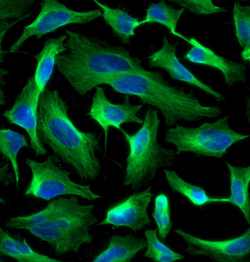 Immunofluorescent analysis of (4% PFA) fixed HeLa cells using Beta Tubulin Rabbit monoclonal antibody(ARA675) at dilution of 1:550 and Fluor 488-Conjugated AffiniPure Goat Anti-Rabbit IgG(H+L).