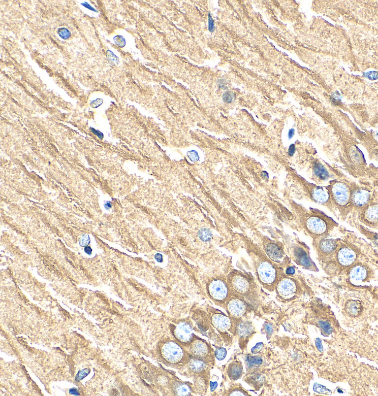 Immunohistochemical analysis of paraffin-embedded rat brain tissue slide using Beta Tubulin Rabbit monoclonal antibody(ARA675) at dilution of 1:1000 (under 40x lens). Heat mediated antigen retrieval with Tris-EDTA buffer (pH 9.0).