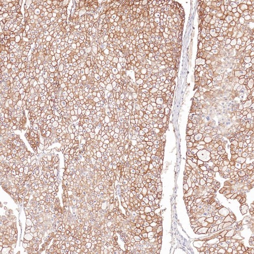 Cadherins are calcium-dependent cell adhesion proteins. They preferentially interact with themselves in a homophilic manner in connecting cells. Cadherin 16 is a member of the cadherin family of cell adhesion molecules that is found in the basolateral membrane of renal tubular epithelial cells of the distal tubules and collecting duct. Studies have shown high sensitivity and specificity of Cadherin 16 to chromophobe renal cell carcinoma (RCC) and oncocytoma. Conversely, low reactivity was observed with clear cell RCC and papillary RCC.