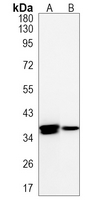 Western blot analysis of Cathepsin H/K/L/V expression in mouse liver (A), rat liver (B) whole cell lysates. (Predicted band size: 37 kD; Observed band size: 38 kD)