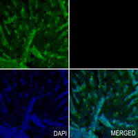 Immunohistochemical analysis of Cathepsin H/K/L/V staining in rat liver formalin fixed paraffin embedded tissue section. The section was pre-treated using heat mediated antigen retrieval with sodium citrate buffer (pH 6.0). The section was then incubated with the antibody at room temperature and detected using an HRP conjugated compact polymer system. Tyramide-AF488 (green) was used as the chromogen. The section was then counterstained with DAPI (blue).