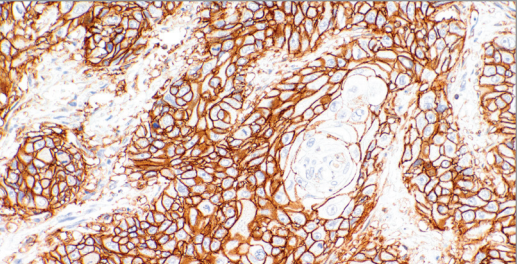 Cluster of Differentiation 44 (CD44) is a glycoprotein receptor for hyaluronic acid that plays a fundamental role in cellular adhesion, stromal binding, migration, and cell-cell interactions. Positive staining with Anti-CD44 is implicated in a multitude of different cancer types, including breast, prostatic, renal cell, colonic, hepatocellular, and genitourinary carcinomas, as well as non-Hodgkin's Lymphoma, metastatic melanoma, gastric cancer, and some soft tissue tumours. It has also been demonstrated that there is a positive correlation between tumour progression and increased expression of CD44v, a high molecular weight CD44 isoform that has been described in epithelial cells. Given the expression of CD44 in a wide range of cancers, the most practical application of CD44 immunostaining is its use in discriminating between urothelial transitional cell carcinoma in situ from non-neoplastic changes in the urothelium.
