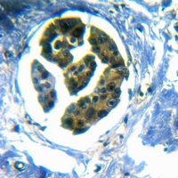 Immunohistochemical analysis of CD70 staining in human breast cancer formalin fixed paraffin embedded tissue section. The section was pre-treated using heat mediated antigen retrieval with sodium citrate buffer (pH 6.0). The section was then incubated with the antibody at room temperature and detected using an HRP conjugated compact polymer system. DAB was used as the chromogen. The section was then counterstained with haematoxylin and mounted with DPX.