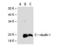 claudin - 1 (XX7). Western blot analysis of claudin - 1 expression in non - transfected 293T (A), human claudin - 1 transfected 293T (B) and SCC - 4 (C) whole cell lysates.