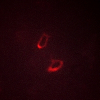 Immunofluorescent analysis of Claudin 1 staining in HeLa cells. Formalin-fixed cells were permeabilized with 0.1% Triton X-100 in TBS for 5-10 minutes and blocked with 3% BSA-PBS for 30 minutes at room temperature. Cells were probed with the primary antibody in 3% BSA-PBS and incubated overnight at 4 °C in a hidified chamber. Cells were washed with PBST and incubated with a AF594-conjugated secondary antibody (red) in PBS at room temperature in the dark.