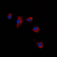 Immunofluorescent analysis of Claudin 2 staining in A431 cells. Formalin-fixed cells were permeabilized with 0.1% Triton X-100 in TBS for 5-10 minutes and blocked with 3% BSA-PBS for 30 minutes at room temperature. Cells were probed with the primary antibody in 3% BSA-PBS and incubated overnight at 4 °C in a humidified chamber. Cells were washed with PBST and incubated with a DyLight 594-conjugated secondary antibody (red) in PBS at room temperature in the dark. DAPI was used to stain the cell nuclei (blue).