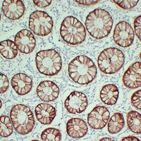 Immunohistochemical analysis of Claudin 4 staining in human colon formalin fixed paraffin embedded tissue section. The section was pre-treated using heat mediated antigen retrieval with sodium citrate buffer (pH 6.0). The section was then incubated with the antibody at room temperature and detected using an HRP conjugated compact polymer system. DAB was used as the chromogen. The section was then counterstained with haematoxylin and mounted with DPX.
