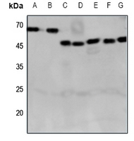 Western blot analysis of CRHR2 expression in HEK293T (A), Hela (B), HepG2 (C), mouse brain (D), mouse lung (E), mouse kidney (F), rat kidney (G) whole cell lysates. (Predicted band size: 47 kD; Observed band size: 53; 66 kD)