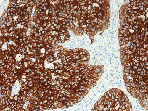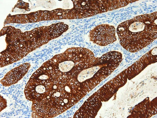 Cytokeratin CAM5.2 is a low molecular weight keratin that reacts with Moll's peptides #7 and #8 (keratins 7 and 8). It's used in pathology as a monoclonal antibody for immunohistochemistry to identify normal and malignant cells of epithelial origin, particularly glandular (secretory) epithelia, and cancers like colorectal cancer, pancreatic cancer, liver cancer, and some breast cancers. However, it's not reactive with squamous epithelium and may have limited staining in some squamous cell carcinomas.