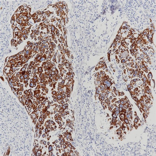 In normal tissues, cytokeratin (high molecular weight) is mainly expressed in normal squamous epithelium, ductal epithelium and other laminated epithelium. Positive expression was found in lung squamous cell carcinoma, breast cancer, pancreatic cancer, cholangiocarcinoma and bladder transitional cell carcinoma. Anti-cytokeratin, high molecular weight is capable of recognizing all basic keratins; therefore, it is a broadly reactive antibody staining most epithelia and their neoplasms. Members of the acidic and basic subfamilies are found together in pairs. Since each epithelium contains at least one acidic and one basic keratin, this antibody is used to observe the distribution of keratin-containing cells in normal epithelia and to identify neoplasms derived from such epithelium.