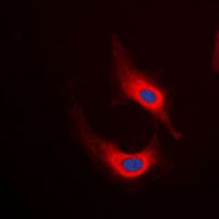 Immunofluorescent analysis of Desmin staining in HeLa cells. Formalin-fixed cells were permeabilized with 0.1% Triton X-100 in TBS for 5-10 minutes and blocked with 3% BSA-PBS for 30 minutes at room temperature. Cells were probed with the primary antibody in 3% BSA-PBS and incubated overnight at 4 °C in a humidified chamber. Cells were washed with PBST and incubated with a DyLight 594-conjugated secondary antibody (red) in PBS at room temperature in the dark. DAPI was used to stain the cell nuclei (blue).