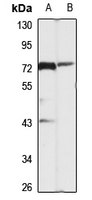 Western blot analysis of DLL4 expression in A431 (A), rat kidney (B) whole cell lysates. (Predicted band size: 74 kD; Observed band size: 75 kD)