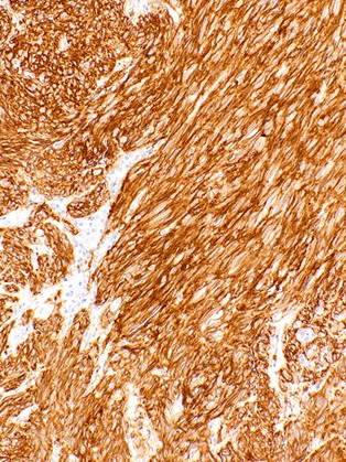Immunohistochemical staining of human GIST tissue using DOG1 Rabbit Monoclonal Antibody (ARM983) .