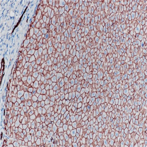 In normal tissues, immunostaining of E-cadherin is localized to the membrane of epithelial cells, consistent with its role in cell adhesion. And in tumor tissues, E-cadherin stains positively in glandular epithelium as well as adenocarcinomas of the lung, gastrointestinal tract, and ovary. It has also been shown to be positive in some thyroid carcinomas.