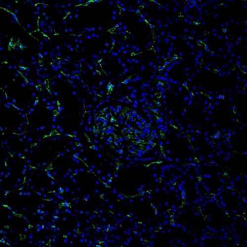 Immunofluorescence analysis of paraffin-embedded human kidney tissue labeling CD34 with Mouse anti-CD34 antibody.FITC Conjugated Goat IgG Rabbit Polyclonal Antibody was used as the secondary antibody at 1/1,000 dilution.