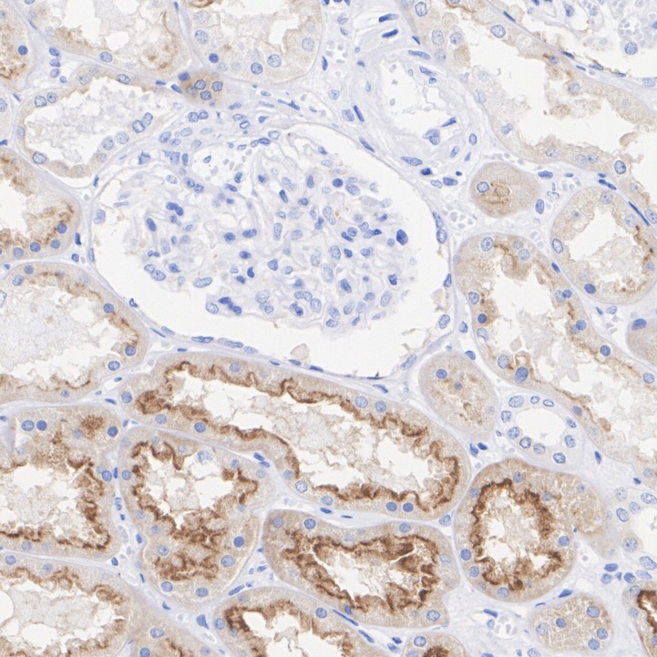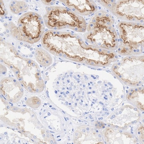 Immunohistochemical analysis of paraffin-embedded human kidney tissue with FOLR1 Rabbit Monoclonal Antibody(ARA992).