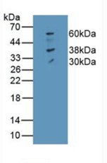 Western blot analysis of Ferroportin in porcine skeletal muscle tissue. Samples were incubated in monoclonal Ferroportin antibody (Product ARA6617).