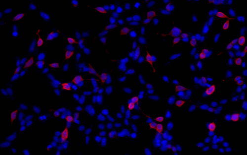 Immunofluorescent analysis of (-20°C Ethanol) fixed Transfected HEK-293 cells using GFP tag Mouse Monoclonal antibody(ARA705) at dilution of 1:800 and Fluor 594-Conjugated AffiniPure Mouse IgG(H+L) Goat antibody.