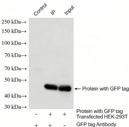 IP result of GFP tag Mouse Monoclonal antibody(ARA705) (IP:4ug; Detection:1:10000) with Transfected HEK-293T cells lysate 400 ug.