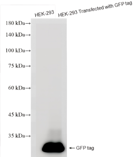 Green Fluorescent Proteins (GFPs) encompass a diverse range of proteins carrying a green chromophore, originating from various species and forming different protein lineages. Wildtype GFP consists of 238 amino acid residues (26.9 kDa). GFP was first identified in the jellyfish Aequorea victoria. It emits green light with a peak wavelength of 509 nm upon excitation by blue light at 395 nm. When fused with other proteins, GFP serves as a versatile reporter protein e.g. for quantifying expression levels or facilitates visualization of subcellular localization through fluorescence microscopy. This antibody is generated against the full-length eGFP protein. It exhibits reactivity towards variants of Aequorea victoria GFP, including S65T-GFP, RS-GFP, YFP, CFP, and eGFP.