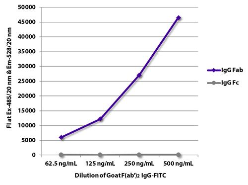 FLISA: The plate was coated with Rabbit anti-Goat IgG Fab antibody and ARG23851 Mouse anti-Goat IgG Fc antibody [SB115h]. Serially diluted ARG20668 Goat F(ab')2 IgG Isotype Control antibody (FITC) was captured and fluorescence intensity quantified.