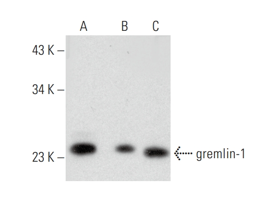 gremlin - 1 (C - 7). Western blot analysis of gremlin - 1 expression in COLO 320DM (A), A549 (B) and Ramos (C) whole cell lysates.