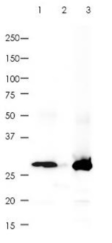 Lane 2: 293 cell lysates transfected with C-terminal GST tagged gene (1:20,000 dilution).