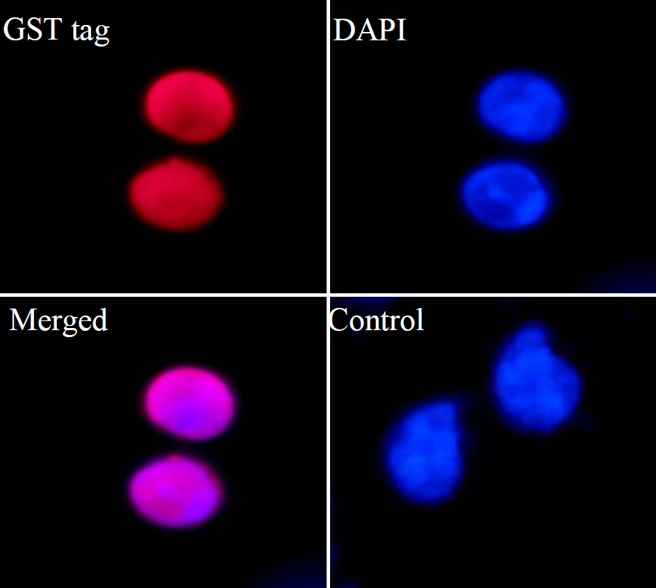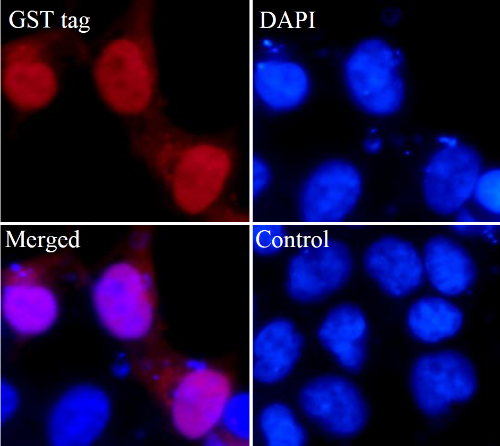 GST tag Rabbit Monoclonal Antibody(ARA804) staining GST tag in 293 cells transfected with N-terminal GSTtagged gene by IF/ICC (immunofluorescence/immunocytochemistry).