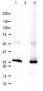 Lane 2: 293 cell lysates transfected with C-terminal GST tagged gene (1:20,000 dilution).