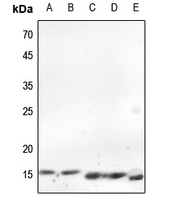 Western blot analysis of Histone H2A.X expression in HEK293T (A), Hela (B), mouse testis (C), rat lung (D), rat testis (E) whole cell lysates. (Predicted band size: 15 kD; Observed band size: 15 kD)