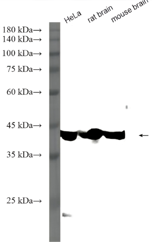 Beta actin, also named as ACTB and F-Actin, belongs to the actin family. Actins are highly conserved globular proteins that are involved in various types of cell motility and are ubiquitously expressed in all eukaryotic cells. At least six isoforms of actins are known in mammals and other vertebrates: alpha (ACTC1, cardiac muscle 1), alpha 1 (ACTA1, skeletal muscle) and 2 (ACTA2, aortic smooth muscle), beta (ACTB), gamma 1 (ACTG1) and 2 (ACTG2, enteric smooth muscle). Beta and gamma 1 are two non-muscle actin proteins. Most actins consist of 376aa, while ACTG2 (rich in muscles) has 375aa and ACTG1(found in non-muscle cells) has only 374aa. Beta actin has been widely used as the internal control in RT-PCR and Western Blotting as a 42-kDa protein. However, the 37-40 kDa cleaved fragment of beta actin can be generated during apoptosis process. This antibody can recognize all the actins.
