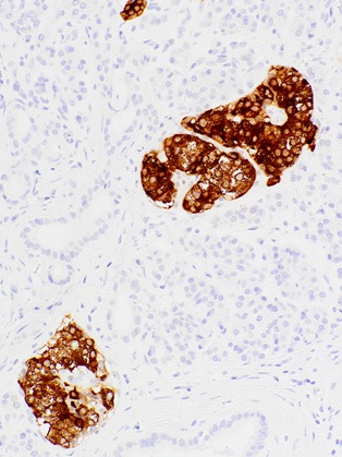 Insulin is a polypeptide hormone produced by the pancreas in the beta cells of the Islets of Langerhans. Its biological functions include regulating the storage and release of glucose, as well as promoting glycogen storage, triglyceride formation, and protein synthesis. Insulin has been clinically indicated in a number of conditions, including tumours of beta cell origin. The presence of insulin in the cytoplasm of islet cell tumours is indicative of functional insulinomas, while a deficiency of insulin results in diabetes mellitus.