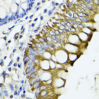 Immunohistochemical analysis of GPR49 staining in human colon cancer formalin fixed paraffin embedded tissue section. The section was pre-treated using heat mediated antigen retrieval with sodium citrate buffer (pH 6.0). The section was then incubated with the antibody at room temperature and detected using an HRP conjugated compact polymer system. DAB was used as the chromogen. The section was then counterstained with haematoxylin and mounted with DPX.