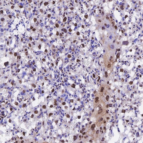 Immunohistochemical analysis of paraffin-embedded human testis tissue with Rabbit anti-Lin28A antibody (ARA838) at 1/1,000 dilution.