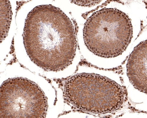 Immunohistochemical analysis of paraffin-embedded rat testis tissue with Rabbit anti-Lin28A antibody (ARA838) at 1/400 dilution.